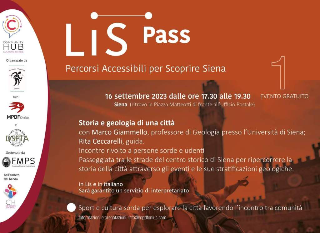 Continuano le attività del Gruppo Trekking Senese dedicate all’inclusione, con la prima di una serie di passeggiate inclusive (sotto il titolo di “LIS Pass: Percorsi Accessibili per Scoprire Siena”) organizzate in collaborazione con la Mason Perkins Deafness Fund: nel tardo pomeriggio di sabato 16 settembre si è svolta una passeggiata accessibile nel centro storico di Siena, rivolto sia a persone udenti che a persone sorde.