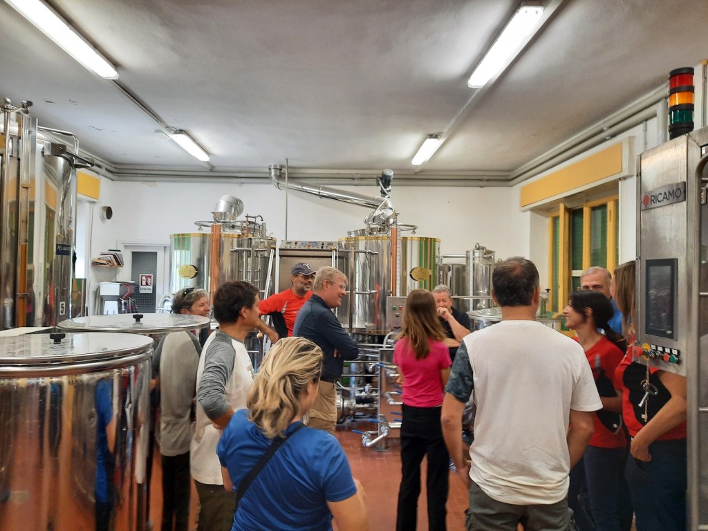 Ma dall’inferno si può risalire al paradiso, “uscendo a riveder le stelle”: dopo un’affascinante visita guidata del Parco delle Biancane, con vista sulle centrali geotermiche che producono energia sfruttando le peculiarità geologiche di questa zona, siamo passati – com’è nostra consuetudine – all’aspetto conviviale e mangereccio. Abbiamo innanzitutto goduto di una seconda visita guidata, questa volta del birrificio artigianale “Vapori di Birra”, che produce “una birra che nasce dal respiro della terra”, impiegando il vapore geotermico, birra che abbiamo poi assaggiato insieme a un buon pranzo nel birrificio.